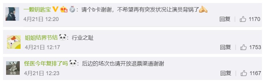 虽然官方致歉了,但是网友并不买单。热门评论里可以看到网友反感留言“请个b卡谢谢,不希望再有突发状况让演员背锅了”“行业之耻”“后边的场次也请开放退票渠道”......
