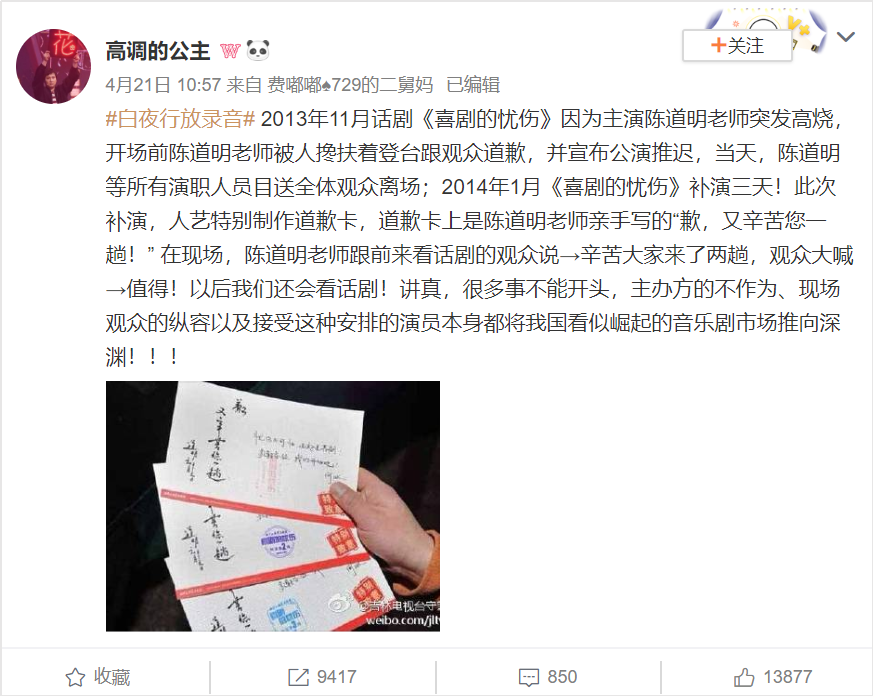 据@高调的公主 博文,陈道明2013年主演话剧《喜剧的忧伤》,因为生病也是推迟了公演,但是诚恳的处理方式让观众为之动容。
