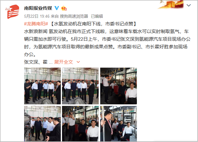 5月22日,南阳报业传媒在微博客类社交媒体平台发布一则市委书记调研氢能源汽车项目博文,一众领导观看了水氢发动机的工作演示,为氢能源汽车项目取得的最新成果点赞,并宣布水氢发动机在南阳市正式下线!