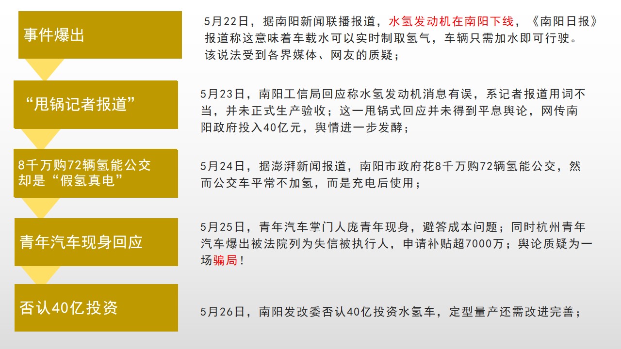 事件发生后,各方媒体迅速跟进南阳水氢发动机背后故事,#南阳花8千万购72辆氢能公交#、#青年汽车集团回应水氢车#等先后成为热搜上的话题,阅读量均超百万,网友调侃该发明“下一个诺贝尔奖指日可待!”