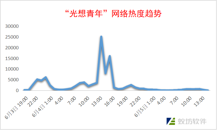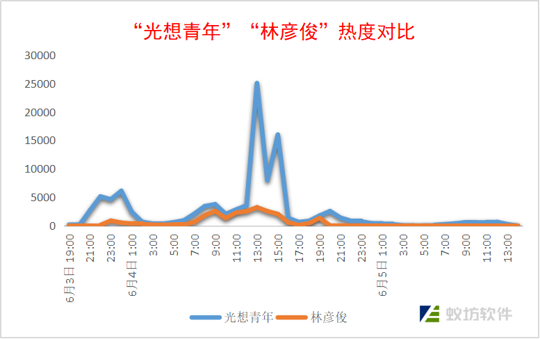 6月3日22:33,@苍南派 带话题#光想青年#发博“我想过买林彦俊演唱会VIP区的票,能离爱豆近一点,但奈何贫穷限制了我...”爱豆“林制霸”的流量正式接入。从上面的热度趋势图可以看出,林彦俊粉丝的参与给这一活动的传播扩散起着推波助澜作用。