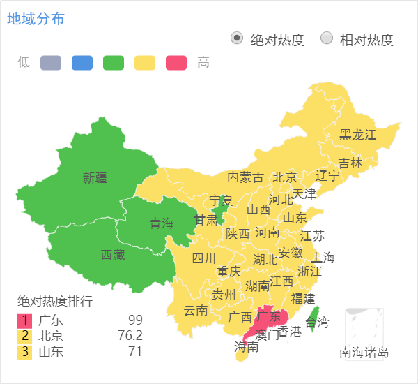 通过舆情监测软件鹰击早发现对关注话题的人群地域进行分析,关注“光想青年”话题的网友遍布全国,其中,“广东”地区以99的热度值居于首位,这与其经济巨头、人口大省有关外,可能与林彦俊在广东生活成长教育的经历有关。另外,北京、山东两地的网友对此也十分地关注。
