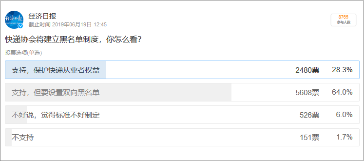 而与此同时,快递行业协会对此事高度关注,拟建立不良用户黑名单制度,网民探讨该制度是否可行?从经济日报发布的话题投票来看,绝大部分网友支持建立黑名单制度,其中64%的网友认为应该设置双向名单。