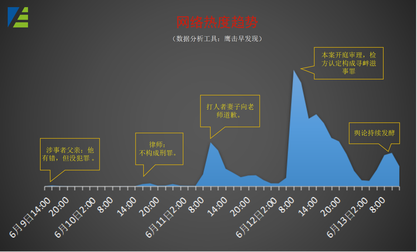 10日,打人者常某的辩护律师郭京朝称,常某的殴打行为触犯了《中华人民共和国治安管理处罚法》,并非寻求刺激无端生事,不构成寻衅滋事犯罪,将做无罪辩护。网友关于其有罪无罪的讨论促使舆情量上升。