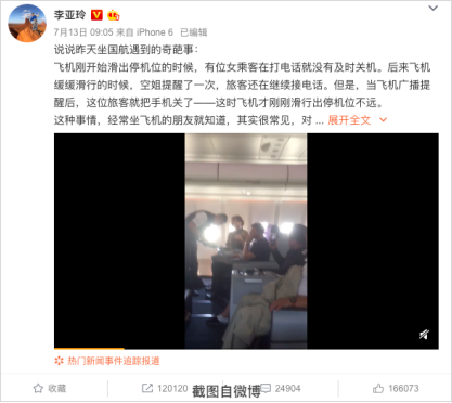 13日,编剧@李亚玲 在网上爆料在乘坐国航时遇见一位自称是“国航监督员”的女士,其在飞行过程中大声斥责玩手机的旅客,称他们影响航空安全。她要求乘务员检查旅客手机,还要求机组扣下几位旅客。结果几位乘客下飞机后被迫接受检查,滞留了七个小时。微博发布后,迅速登上热搜榜,在网上引起舆论哗然,争议不断。