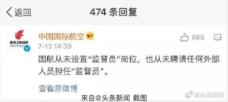 3、13日14:39,@中国国际航空 在官方微博中回复称:国航从未设置“监督员”岗位,也从未聘请任何外部人员担任“监督员”。