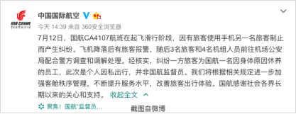 6、15日下午,@中国国际航空 针对“监督员事件”进行回应称:经核实,纠纷一方旅客为国航一名因身体原因休养的员工,此次是个人因私出行,并非国航监督员。国航将根据相关规定进一步加强客舱秩序管理,不断提升服务水平,改善旅客出行体验。
