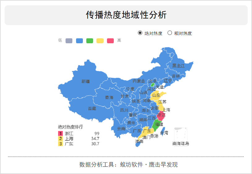 从传播热度的地域性分布来看,凸显出地理上的接近性,即可能受到台风影响的地域其传播热度相对较高。总体上来看,东部沿海地区的传播热度普遍较高。其中浙江地区的传播热度最高,这主要是由于利奇马台风将首先于浙江登陆;上海、江苏、山东的传播热度也相对较高,这主要是由于利奇马台风登陆后极有可能将从浙江逐渐北上,上海、江苏、山东都将会受到影响;由于广东地区位居东南沿海且往年台风频繁自然对台风关注度较高,再加上广东连续炎热,很多网友表示希望台风可以为广东带来大雨,缓解炎热天气。