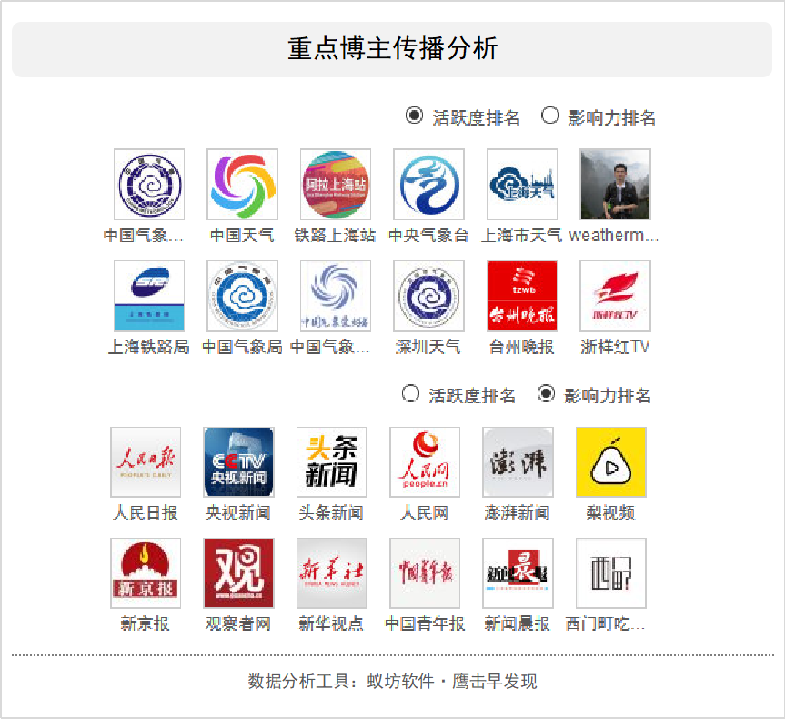 根据蚁坊软件舆情监测系统显示,对利奇马台风预警信息传播起绝对作用的传播主体是专业性气象官微和综合性新闻媒体。其中专业性气象官微在台风预警传播过程中表现出积极的活跃度,@中国天气 、@中央气象台 等气象博主始终保持及时且高频的报道;而综合性新闻媒体依靠自身的影响力也积极进行传播,@人民日报 、@央视新闻 、@人民网等主流媒体合力扩散,@头条新闻 、@澎湃新闻 、@梨视频等平台媒体也积极转发、即时报道。这些传播主体的协同传播,加强了利奇马台风预警信息的传播力度、扩大了传播影响力。