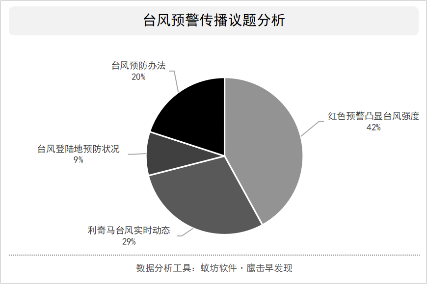 各类媒体对利奇马台风预警传播的议题主要分为红色预警凸显台风强度、利奇马台风实时动态、台风预防办法以及台风登陆地预防状况等方面,其中红色预警凸显台风强度的传播议题占比最高,为42%,主要是介绍此次台风的影响力以及可能出现的破坏力;对利奇马台风实时动态的传播议题占比为29%,这部分传播主要是来自各气象官微;还有一部分传播议题为台风的预防办法,占比为20%;除此之外,台风登陆地的预防状况也成为一部分传播议题,占比为9%,例如@梨视频 报道的浙江景区游客的撤离以及渔船紧急回港避风等内容。