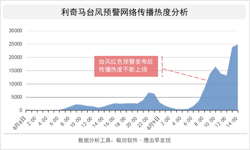 利奇马台风预警信息的传播热度从8月8日开始显现,随着各气象部门发布台风的超强影响力和台风的逐渐逼近,其传播热度不断上升。尤其是8月9日6时许中央气象台发布利奇马台风红色预警,其传播热度不断上扬,截止到8月9日14时,其传播热度仍然处于上升状态。