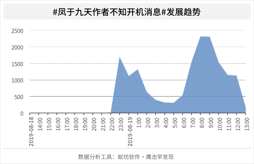 从舆情监测软件鹰击早发现对事件发展趋势进行分析,18日15:57@凤于九天 官宣后,并没有引起网友关注,直到22点才引发热议,22:47@风弄 发博表示不知道开机消息,舆情热度迅速到达第一波巅峰,随后稍有下降,但是随着@新浪娱乐、@虹桥一姐、@头条新闻娱乐、@热门快播 等博主的传播报道,事件于19日8:00-9:00达到第二波舆情量巅峰。