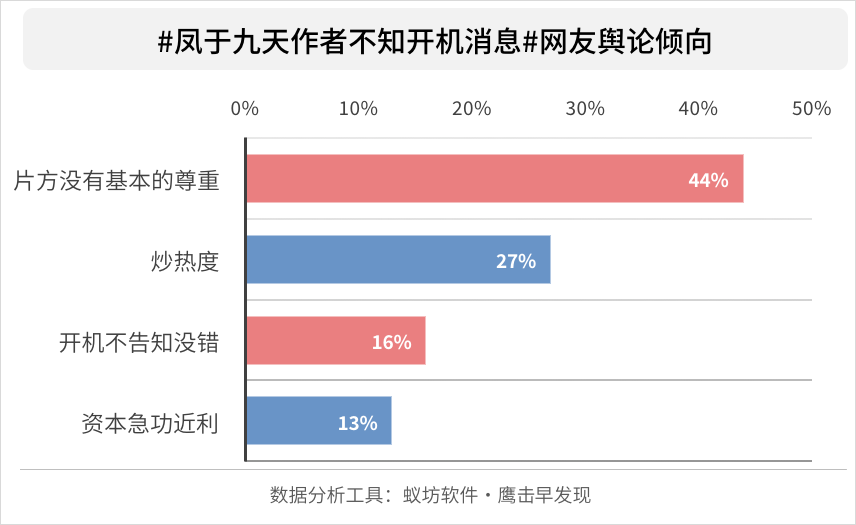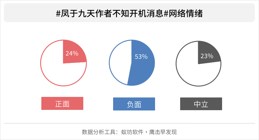 一般来说,电视剧开拍前知会作者是人知常情,而《凤于九天》要开拍了,亲妈却连消息都没有收到,还是让不少书粉感到不满,从鹰击早发现分析的网络情绪来看,负面占比达到半数,那么剧组的做法是否欠妥呢?网友又是如何看待的呢?我们来看看吧: