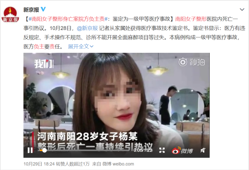 10月23日,整容死亡鉴定结果公布,鉴定意见为一级甲等医疗事故,医方负主责。家属称,将移交公安机关立案。