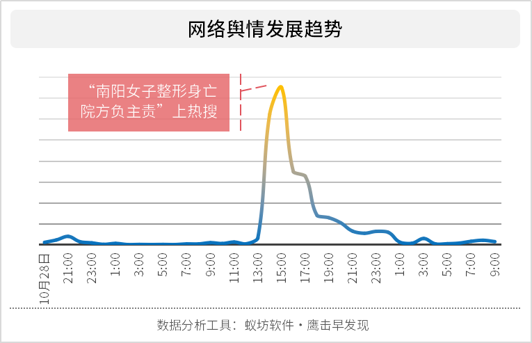 10月28日19:41,@新京报我们视频 率先报道事件调查进展【南阳女子整形身亡院方负主责:一级甲等医疗事故】,随后,@中国新闻周刊 @新京报 等媒体相继助力报道。但是从蚁坊软件舆情监测系统的网络舆情传播趋势图来看,传播、影响力有限。