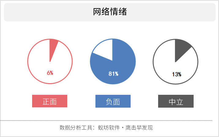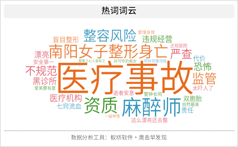 此次南阳女子整形医院内死亡鉴定书显示:医方有违反规定、手术操作不规范、诊所不能开展全面麻醉项目等过失。本病例构成一级甲等医疗事故,医方负主要责任。又一个为了美丽而付出生命的惨痛整容失败案例使得网络情绪呈现绝对的负面,占比81%。
