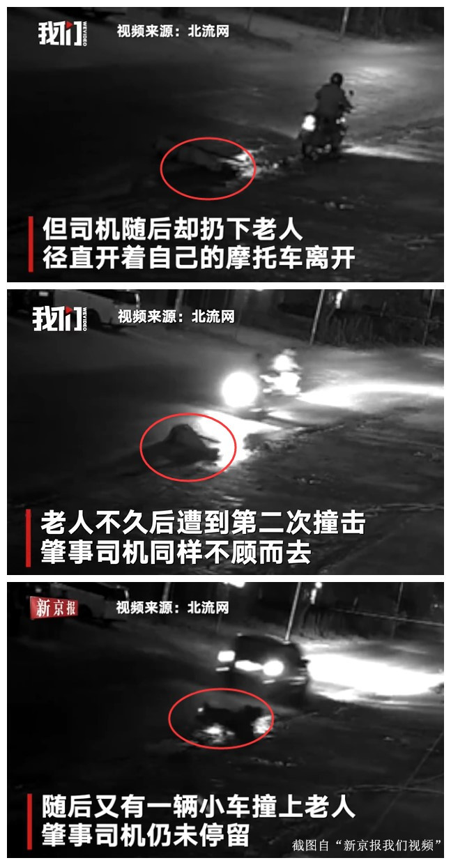 第二次:摩托车司机驾车逃逸后不久,老人很快遭到了第二次碰撞,这一次,肇事司机只是回头看了一眼继续驾车逃离了现场。