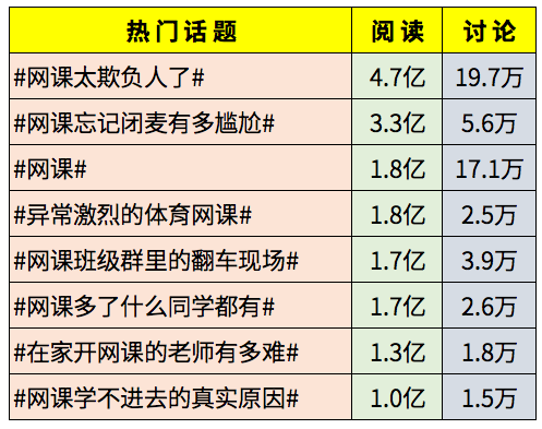 对于首次面对线上直播授课的老师、学生、家长来说,其中的各种翻车、困难、尴尬事件层出不穷,相关话题不断刷屏,其中#网课太欺负人了#阅读量更是达到4.7亿,讨论量近20万,有关网课相关的舆论热度从2月份开始迅速发酵,这与学生上课时间有着不可分割的关系。