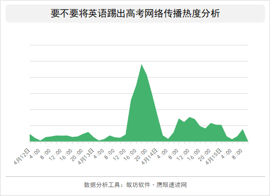 关于“郑强教授:把英语踢出高考”这一新闻话题最初主要是在B站、抖音这些视频类的网络平台传播开来的,其中抖音上的传播力度最强。随后出现在知乎、微博客等网络平台上进行相关话题的讨论,传播热度也随之不断升高,并在4月13日晚间传播热度达到最高。