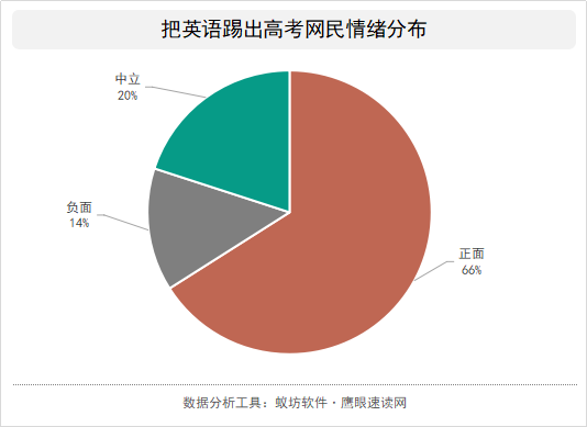 由于大部分的传播主体对郑强教授演讲内容的传播主题定位为“要不要把英语踢出高考?”对于大部分网民来说,面对热点话题他们是很善于做选择题的,并会轻易给出答案。从舆论表现来看,学了多年的英语到最后确实没有什么实际作用,这也由此引发了广大网友的共鸣,所以他们赞成将英语踢出高考。从网民的情绪分布中也能看出,把英语踢出高考这一话题下的网民正面情绪占比最高,高达65%,由此可以看出把英语踢出高考的网络舆论支持度还是比较高的。