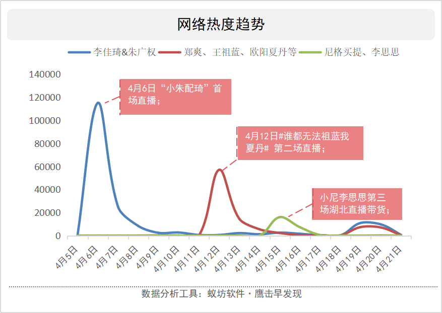 从三场直播的网络数据来看,网民反馈热度最高的为4月6日央视新闻主播朱广权与带货top主播李佳琦的连麦直播,不仅创造了3.1亿的话题阅读量,在网络上舆情热度持续,话题讨论量#朱广权李佳琦直播#达20万、#小朱配琦#达到13.3万。