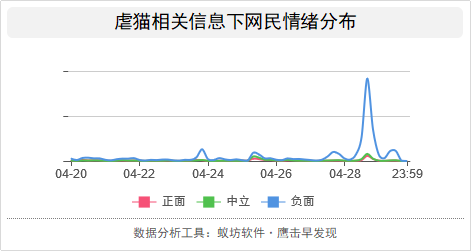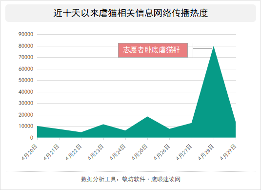 近十天以来,网络上形成一定传播热度的虐猫相关信息有“起底虐猫嗜血产业链”、“虐猫团伙追踪”、“起底虐猫黑色产业链:包含未成年人,私人订制可达四千元”、“动物版N号房”、“男子按住猫让大狗撕咬”、“高中生虐猫赚钱为买手机”、“志愿者卧底虐猫群”等。其中,4月28日@澎湃新闻 发布的“志愿者卧底虐猫群”这一新闻的网络传播热度最高,并且引发了网民的热议。