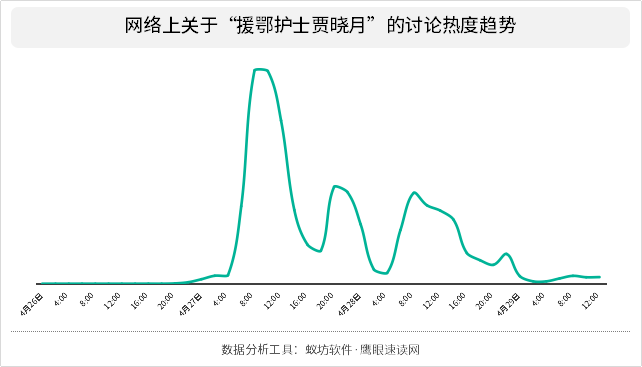 4月27日,贾晓月刷屏了。刷屏的原因是前一天晚上@陈兆鹏先生 发帖讲述“有个民营单位的护士,当初独自一人去援助武汉,援汉结束后也没有掌声和优待,就连返回的车票都是自己默默买的……”这一消息吸引了姚晨、于建嵘、春卷、奥卡姆剃刀等微博大V纷纷转发评论,贾晓月个人抗疫英雄事迹随之大范围传播开来,有无数网友瞬间感动泪目,有部分网友为其打抱不平,有一些网友对真实性提出质疑,还有知情网友在线辟谣,比如@辟谣知真相 @舍予中医shu @科学未来人 等等,导致舆论热度飙升并且开始出现反转迹象。