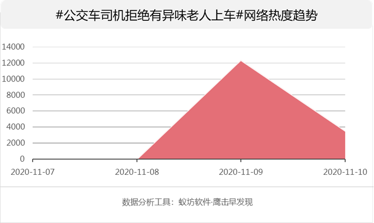 根据蚁坊软件舆情监测系统鹰击早发现对微博客类社交网络进行数据分析,该事件在众多媒体的关注和报道之下,于11月9日达到舆情波峰。截至11月10日16时,#公交车司机拒绝有异味老人上车#阅读总量达到1亿。从事件的整个过程来看,视频最早由某网友爆出,9日中午至下午经多家大V报道后热度达到最高。最初的舆论观点基本以同情老人、指责司机为主。至傍晚时分事件进一步发酵,后续该名老人在公交车存在多次不雅行为也被爆出,部分舆论观点转而支持司机,围绕司机做法的讨论又产生了一次舆论波动。
