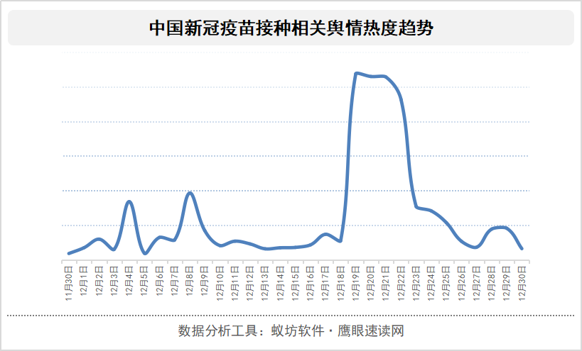 据舆情监测系统鹰眼速度网显示,近一个月以来,网络上关于“中国新冠疫苗接种”的舆情热度持续在线,至12月19日呈现直线上升态势,之后虽然逐渐回落,但讨论量仍然维持在较高水平。