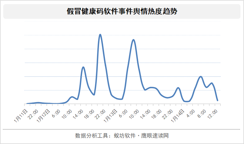 从舆情监测系统鹰眼速读网针对“假冒健康码软件事件”舆情热度趋势分析来看,1月11日22时左右,@路诞先生 初始爆料之后,网络热度出现了小幅上升,网民纷纷提醒中国警方在线、杭州公安、杭州网警、平安北京、公安部刑侦局、首都网警等相关部门,初步引起了舆论关注。1月12日至13日,伴随着共青团中央、人民日报、中国长安网等媒体跟踪报道假冒健康码软件事件,相关舆情进入爆发期,舆论逐渐形成“必须严厉打击这种违背社会秩序的动作”“严重干扰破坏防疫”的共识。1月14日,仿造健康码软件开发者被杭州警方查处的消息再度掀起网络关注度的聚集,热度有所回升。