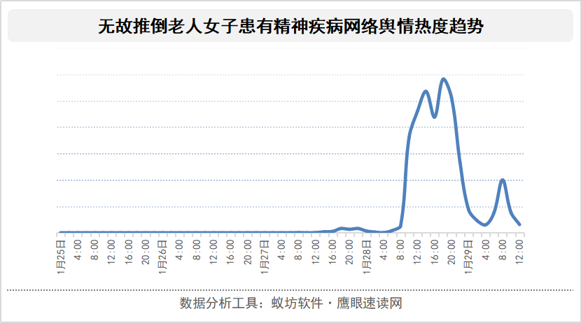 据舆情监测系统鹰眼速读网分析显示,无故推倒老人女子患有精神疾病一事网络舆情热度于1月27日16时许开始小幅上升,至1月28日20时左右到达舆情峰值,1月29日热度略有反弹,整体舆情发酵持续在3天时间,且舆情热度随着事件的关键推进点而不断产生变化。具体来看,可划分为舆情酝酿期、舆情爆发期和舆情回落期三个时期。