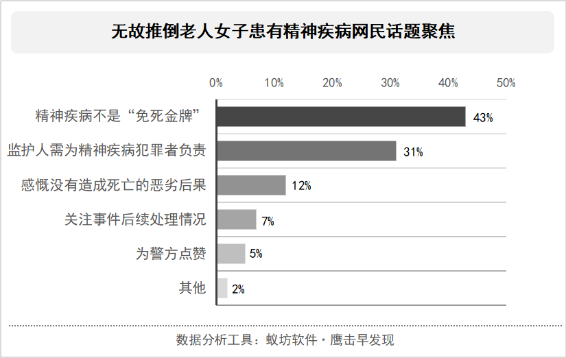 从无故推倒老人女子患有精神疾病的网民话题聚焦来看,明确表态“精神疾病不是‘免死金牌’”、“精神疾病不是脱罪理由”网民话题占比最高,到达43%;其次,认为“监护人需为精神疾病犯罪者负责”的网民话题占比31%,质问精神疾病患者为什么能乱跑、不应该住院治疗吗?感慨没有造成老人死亡的恶劣后果的网民话题占比12%,“这要是后边来了辆车呢,老太太就不是骨折这么简单了”、“老人家最怕摔跤了,老来骨质疏松很轻易就骨折瘫痪什么的”;关注事件后续处理情况的网民话题占7%;为警方点赞占比5%;另外还有2%的其他言论,比如精神病也知道欺软怕硬、怎么不推壮汉、不要让精神病抑郁症背黑锅等等。