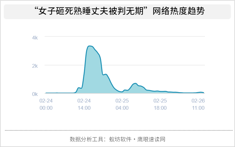 通过全网舆情监测软件鹰眼速读网对“女子砸死熟睡丈夫被判无期”事件的网络热度发展趋势进行分析,事件的较早传播是2月24日的零时,天气网“热点”栏目以《女子砸死熟睡丈夫被判无期是怎么回事,女子砸死熟睡丈夫被判无期事情始末 》为题进行报道,随后,视频网站“爱奇艺”发布了一条视频—“雷达热点:女子砸死丈夫被判无期”介绍事件详情。由于时间特点,事件关注度较低。