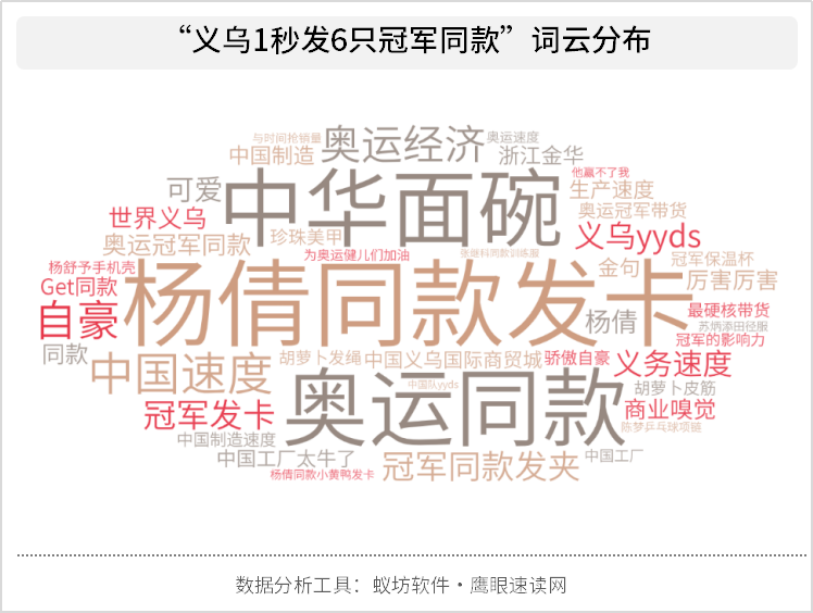 浙江义乌,与奥运相关的产品出现热销。在本届奥运会上获两枚金牌的杨倩头上佩戴的小黄鸭发卡和胡萝卜皮筋成了爆款,话题#义乌1秒发6只冠军同款##杨倩小黄鸭发卡半天卖上万件#更是被网友顶上了热搜,阅读量分别1.6亿、2.1亿。从舆情监测软件鹰眼速读网关于“义乌1秒发6只冠军同款”的词云分布来看,舆论反馈主要集中在“冠军效应下的新型‘顶流’带货”“中国工厂的‘奥运速度’”两个方面: