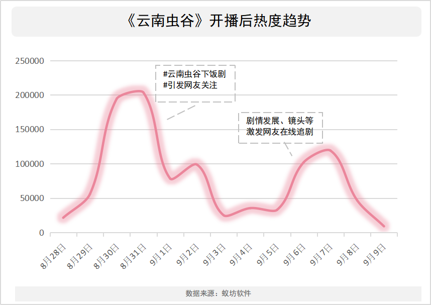 基于舆情分析系统鹰眼速读网分析,《云南虫谷》开播之前已经出现一波话题预热促使舆情热度不断攀升,这一阶段的信息内容来自于主演潘粤明等博文互动与片方@网剧鬼吹灯 发布的云南虫谷王的献祭片头等,凭借恢弘特效制作以及高能片段燃起网民兴趣,#云南虫谷片头质感绝了#等话题聚集网民关注。