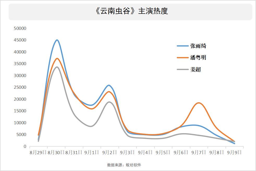 另一部分言论则是对“铁三角”角色的讨论,其中潘粤明饰演的谋略过人、成熟稳重的摸金校尉角色,爱耍贫嘴讲义气的王胖子以及张雨绮饰演的美艳Shirley杨,均给观众留下了深刻印象。从主演的热度分布来看,关于《云南虫谷》张雨绮热度略高于另外两位主演潘粤明和姜超,伴随电视剧热度不断波动。
