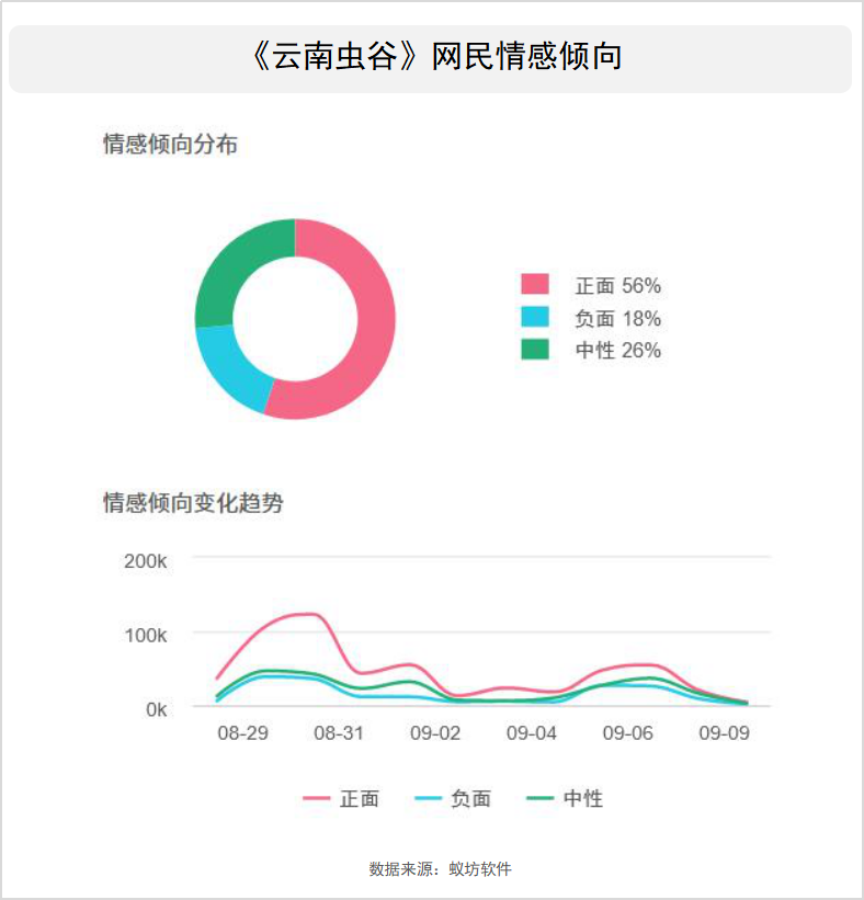 从情感倾向变化趋势来看,开播以来基本是以正面情绪为主。其中正面言论主要集中表现在点赞铁三角的演绎自然真实,主创团队用心、实景拍摄、虫子特效等众多元素贴合原著粉心中的《云南虫谷》。部分吐槽声音则来自于沉浸式追剧过程中,过审剪辑、胡八一与Shirley杨暧昧感情戏以及支线剧情拖沓等。