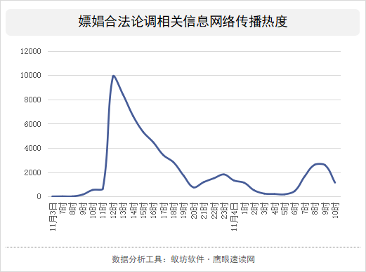 11月3日早上,法治日报刊文内容直指当下网络中被提及的嫖娼合法的相关论调,立场鲜明地指出“嫖娼合法化”等陈词滥调当休矣!随后这篇文章中的相关内容在网络中逐渐传播开来,不少网友纷纷转发分享。上午十点左右,观察者网转发了这篇文章,成功地将相关信息的关注热度迅速引爆,一时间网络中关于“嫖娼合法论调当休矣”的新闻话题登上了各大热搜平台。中午时分,自媒体博主@周末老师的日常 发出了一则关于《姐姐妹妹站起来》的电影片段视频,以此反对嫖娼合法化的相关论调,这篇博文的发布也引发了极大的关注热度,产生了数万条的转评。另外,博主@锦鲤仙子本仙 发表的相关抨击嫖娼合法化论调的博文也在网络中引发了很大的共鸣。随后很多拥有一定粉丝量的大V们也纷纷针对此事发声,网络传播热度不断攀升,达到峰值。随后开始呈现不断下降的趋势,在下降的过程中,自媒体们仍旧保持着一定的讨论积极性。11月4日,关于嫖娼合法论调的信息仍旧在网络中传播,从传播的内容来看,一方面是对前日媒体评论内容的转发扩散,另一方面则是针对于嫖娼合法化论调发表观点。这些内容的传播扩散,使其仍旧保持一定的关注热度。
