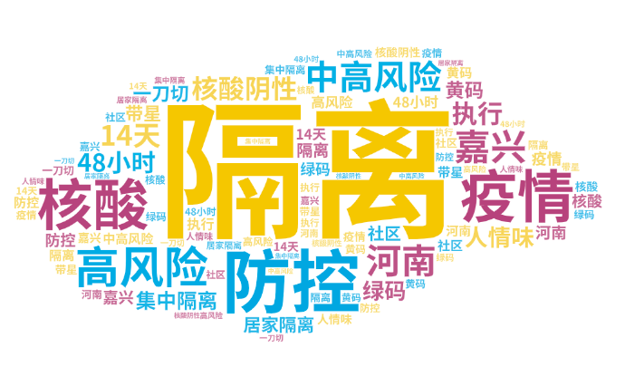 对于行程码带星这一话题,网民热议多集中在几个方面:“防控、高风险、中高风险、核酸、河南、黄码”等对于中高风险、高风险地区的疫情防控及行程码问题;“人性味、嘉兴”等对于当地防疫政策及执行方式的赞扬和肯定;“绿码、48小时核酸阴性”等对于低风险地区返程相关问题;“隔离、集中隔离、居家隔离、14天”等对于行程码带星返程及隔离问题;“社区、执行、一刀切”等反映当地社区疫情防控一刀切问题。