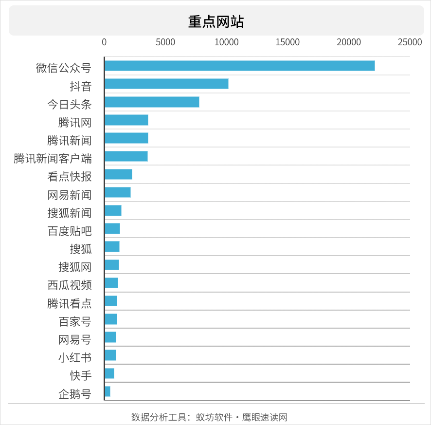 根据专业互联网舆情监测软件鹰眼速读网对行程码带星相关信息传播的主要网站进行分析,位于前三位的分别是微信公众号、抖音、今日头条。其余多集中在新闻网站和自媒体平台中。微信公众号具有可移动性强、用户群体不限、关注率高、覆盖面广、传播速度快、可积累口碑、线上服务方便、人力成本低、效果持续时间长、互动性强等特点,近年来成为信息传播的重要平台。短视频平台相较于平面信息而言更具有立体性,与此同时,抖音契合了当下网民碎片化的娱乐方式,大数据精确算法推荐,充分满足受众需求,针对不同的用户,进行不同的推送,精准化满足分众市场,因而使得信息能够快速传播,精准传播。