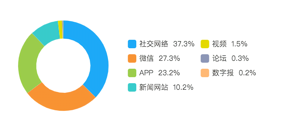 有关“养老 诈骗”的舆情主要集中在社交网络平台之中,相关舆情量约占总量的37.3%,其次为微信(约占27.3%),新闻APP(约占23.2%),新闻网站(约占10.2%)。