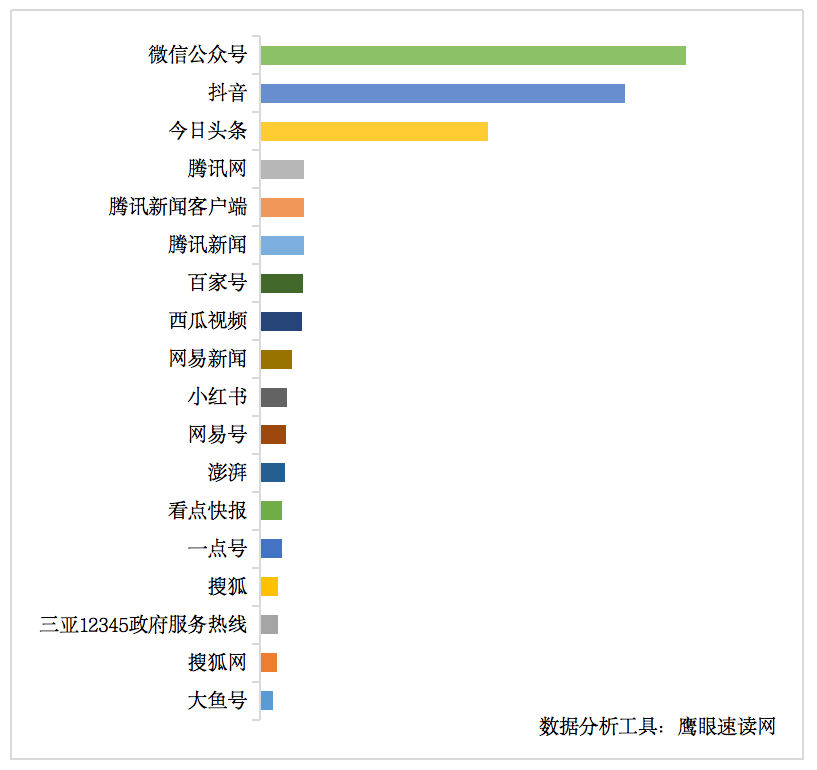 通过统计分析,有关“三亚疫情”的舆情量主要来源于“微信公众号”,占比约为11.9%。其次为“抖音”,占比约为10.2%。“今日头条”,占比约为 6.4%。另外腾讯网、腾讯新闻客户端、腾讯新闻、百家号、西瓜视频、网易新闻、小红书、网易号、澎湃、看点快报、一点号、搜狐、三亚12345政府服务热线、搜狐网、大鱼号等平台均有一定数量的传播。