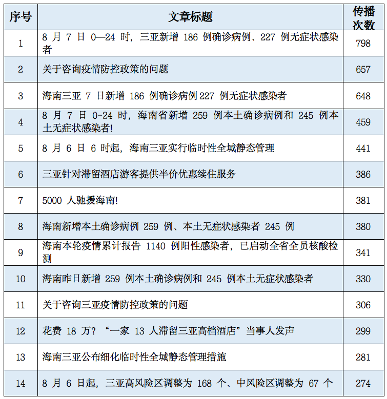 8月6日6时起,三亚市实行临时性全域静态管理。随后,#一家13口滞留三亚7天将花18万#、#有三亚酒店涨价超4倍#、 #当事人回应滞留三亚7天将花18万#、#海南派人处置个别酒店先提价再打折#等话题及有关三亚疫情的最新情况及政策等新闻信息在各大社交平台中热传。