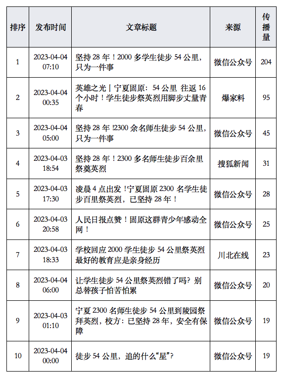从有关“宁夏固原师生徒步54公里祭英烈”的热门文章排行情况可知,该时段内,《坚持28年!2000多学生徒步54公里,只为一件事》、《英雄之光丨宁夏固原:54公里 往返16个小时!学生徒步祭英烈用脚步丈量青春》、《坚持28年!2300余名师生徒步54公里,只为一件事》等文章引媒体热载。此外还有,《坚持28年!2300多名师生徒步百余里祭奠英烈》、《凌晨4点出发!宁夏固原2300名学生徒步百里祭英烈,已坚持28年!》等报道被广泛传播。