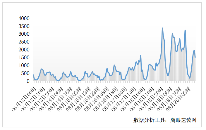 从6月13日0时至6月20日10时,全网有关“多地暴雨”的舆情热度呈现上升趋势,特别是从6月18日开始,相关网络舆情快速增长,其中,舆情最高峰出现在6月18日22时。