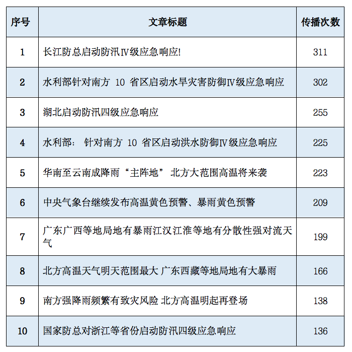 6月18日,从媒体报体报道来看,主要围绕各地暴雨情况、受灾情况、暴雨预警、防灾提醒等方面进行。如:“湖北宜昌突发狂风暴雨 大风掀翻户外大排档 多人被带飞”、“贵州多地出现大暴雨,最大降雨量184.9毫米”、“湖北恩施遭遇暴雨,成片汽车被淹,垃圾桶被冲走”、“长江防总启动防汛Ⅳ级应急响应”、“贵阳发布暴雨红色预警:多地将达到大暴雨以上量级,特别提醒防灾”等相关新闻被媒体广泛报道传播。