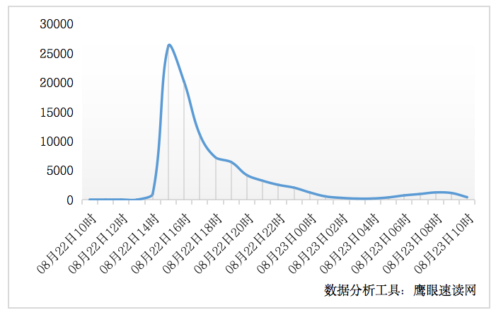从8月22日10时至8月23日10时,全网有关“天津一高楼发生火灾”的相关舆情热度呈直线上升趋势,经过短视频平台、自媒体平台、社交网络的广泛传播带动之下,舆情最高峰出现在8月22日15时。