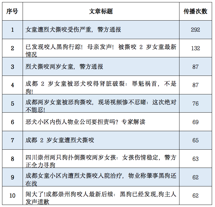 根据互联网舆情监测分析软件蚁坊鹰眼速读网系统的分析,有关“成都女童小区内遭烈犬撕咬受伤”热门文章前十如下: