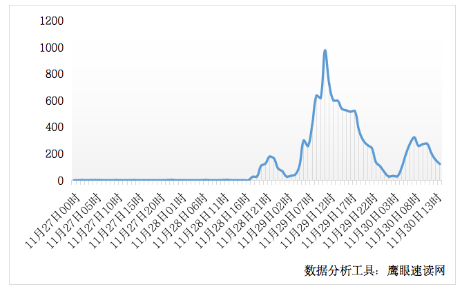 从11月27日00时至11月30日14时,全网有关“辽宁一小学班级集体罢课”的舆情热度在29日迅速发酵,其中,舆情最高峰出现在11月29日11时。