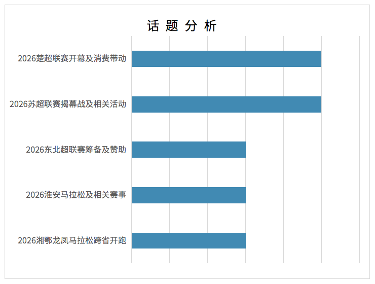 随着全国多地群众性体育赛事集中开赛,“赛事文旅”话题网络舆情持续升温。舆情最高峰出现在4月12日,与“苏超”“楚超”等大型赛事在4月11日至12日集中举办揭幕战和首轮比赛直接相关。通过“鹰眼速读网”系统抽样及内容聚类分析,舆论焦点主要集中在三大方向:“2026苏超联赛揭幕战及相关活动”占比26.3%,“2026楚超联赛开幕及消费带动”同样占比26.3%,“2026湘鄂龙凤马拉松跨省开跑”占比15.8%。全网信息中正面信息占71%,中性占25.7%,负面仅占4.3%,整体舆论氛围积极。